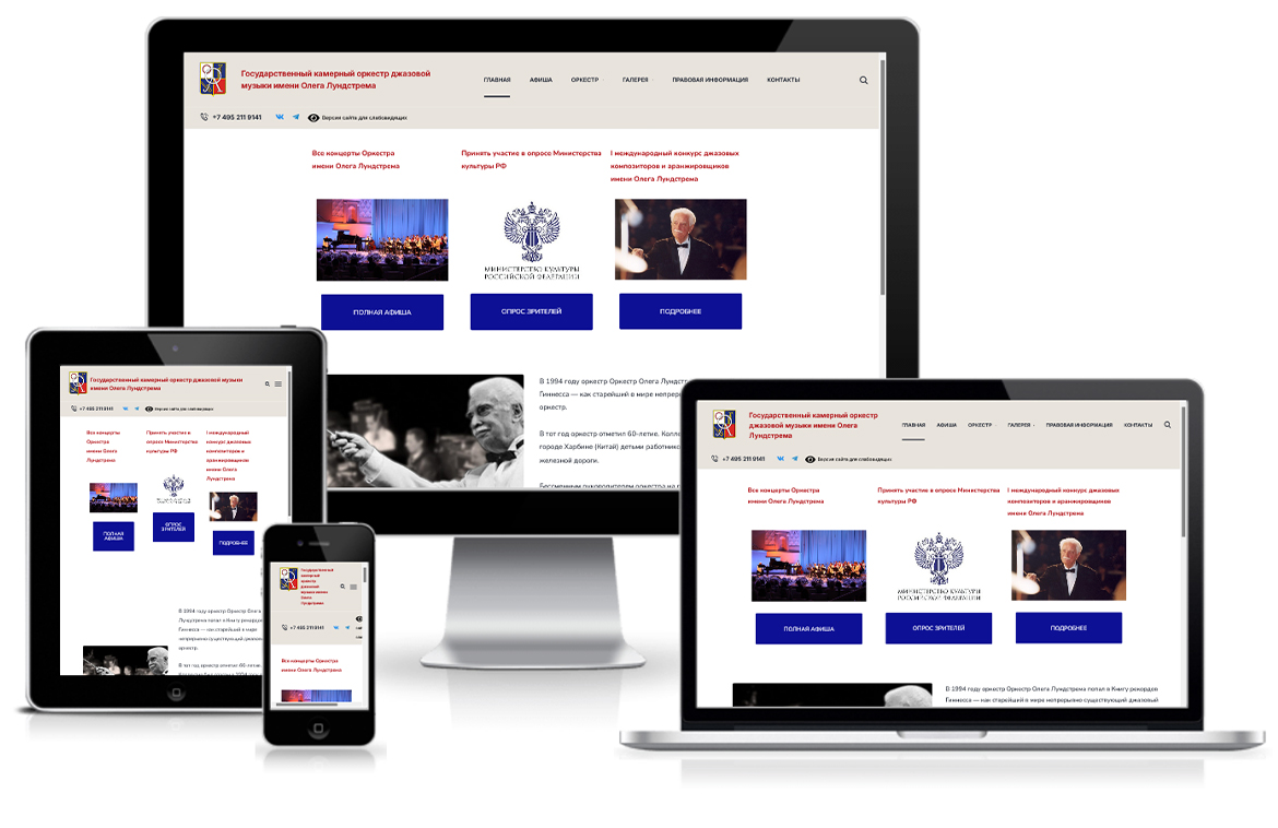 Джазовый Оркестр имени Олега Лундстрема Seo Лама создала сайт для Оркестра Олега Лундстрема из Книги рекордов Гиннесса: версия для слабовидящих, удобная афиша концертов и современный дизайн.